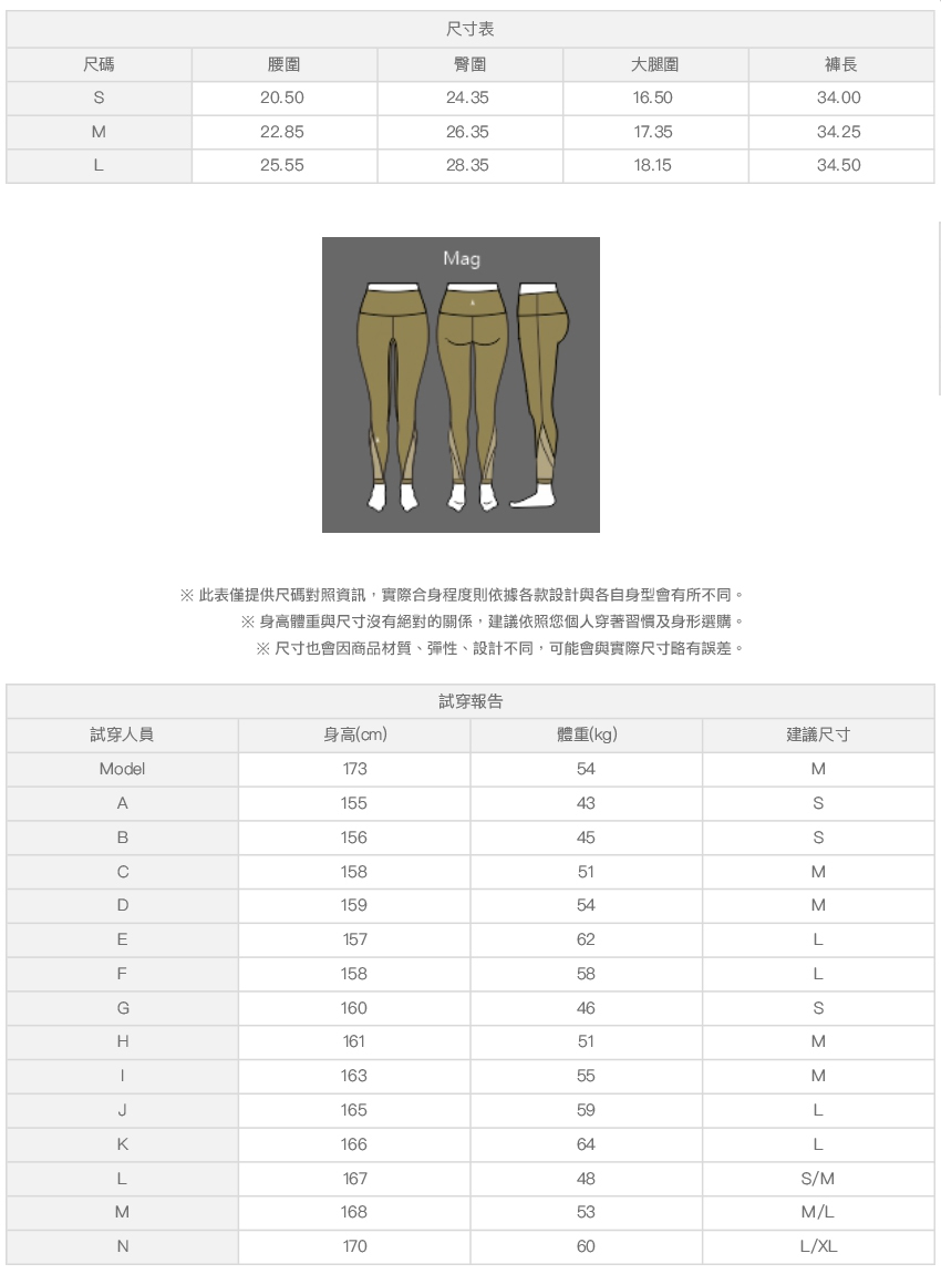※ 尺寸表及試穿報告僅提供尺碼對照資訊,實際合身程度則依據各款設計與各自身型會有所不同。