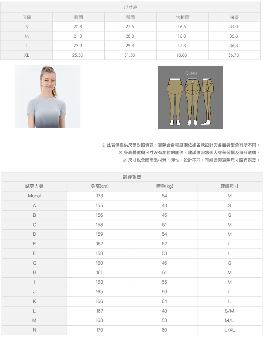 ※ 尺寸表及試穿報告僅提供尺碼對照資訊,實際合身程度則依據各款設計與各自身型會有所不同。