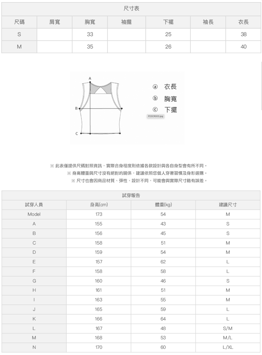 ※ 尺寸表及試穿報告僅提供尺碼對照資訊,實際合身程度則依據各款設計與各自身型會有所不同。