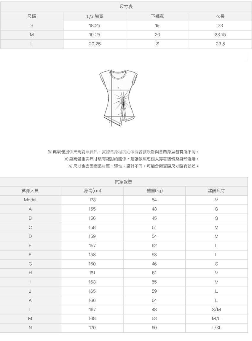 ※ 尺寸表及試穿報告僅提供尺碼對照資訊,實際合身程度則依據各款設計與各自身型會有所不同。