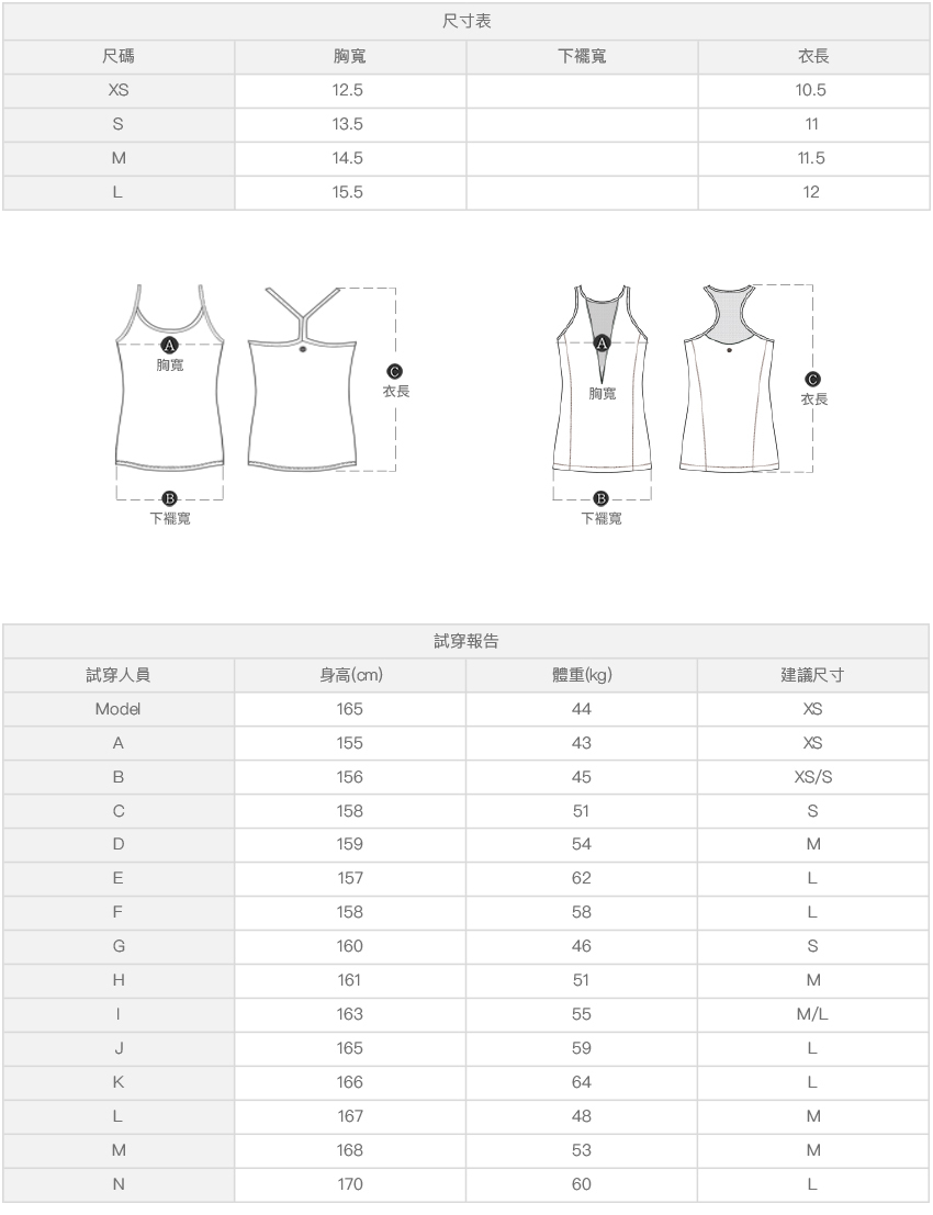 ※ 尺寸表及試穿報告僅提供尺碼對照資訊,實際合身程度則依據各款設計與各自身型會有所不同。
